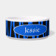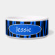 Give your pet a modern edge with this cool black and blue zebra striped food dish! Pet dish features a black and blue zebra stripe pattern all around with a blue oval area with white trim on each side. Inside each oval is text in white font to be customised with your pets name.