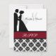 Black and white damask print with a cranberry band, a silhouette bride and groom, and areas you can personalise with your RSVP information, couple's names and monogram initial.