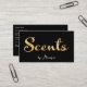 A business card for businesses selling scented items. This card features a black background with the words "Scents" in faux gold foil text.