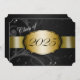 Black and gold graduation party invitation with light and dark black floral and a golden ribbon going across showing the year of graduation. The back of the card is black with light gold font for people to fill in the graduation party announcements.