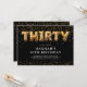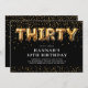 Modern 30th birthday invitation featuring a stylish black background, a scattering of gold glitter confetti, gold hellium balloons that spell "thirty", and a elegant party text template that is easy to personalise.