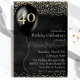 This custom invitation features a fabulous 40th birthday party theme. A large black balloon is placed on the left with "40" printed in a gold foil design. Gold glitter confetti accents the top and bottom portions. It's perfect for a birthday, anniversary, or other special occasion.