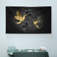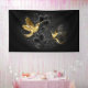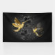 Black and gold jewellery hummingbirds on grey background decorated with plants. Jewellery birds. Golden bird. Gold bird.