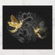 Black and gold jewellery hummingbirds on grey background decorated with plants. Jewellery birds. Golden bird. Gold bird.