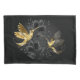 Black and gold jewellery hummingbirds on grey background decorated with plants. Jewellery birds. Golden bird. Gold bird.