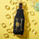 Fun bottle cooler design features gold decorated letter H with pretty watercolor sunflower bouquet, customisable gold modern text on black background