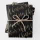 Christmas gift wrapping paper set feature faux gold modern calligraphy merry Christmas script, bold snowflakes and textured stars on colour editable black background.