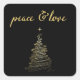 Christmas holiday stickers with a black background, golden text that reads Peace and Love, and a golden swirly Christmas tree with star! We have the matching Black and Gold Merry Christmas holiday photo cards, address labels, and postage stamps too!
