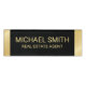 This name tag features name and title in gold modern sans serif font style on black with gold border background.