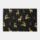 Elegant gold reindeer surrounded by stylised gold Christmas trees, gold snowflakes, and white stars on a black background.