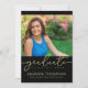 Celebrate your achievement with this graduation photo card featuring a graduate photo template and gold calligraphy script for a timeless touch. The black and gold design adds a bold yet elegant typography style, perfect for announcing your class of milestones. Whether for high school or college, this simple, minimalist, and stylish trendy card beautifully showcases your senior pictures. Personalise yours today for a sophisticated graduation announcement!
