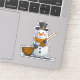 A snowman wearing a black and gold top hat, gold scarf, black gloves, and 3 coal buttons holds a broom. This fun art is great all winter long.