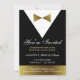 Black and gold tuxedo invitations for your formal dinner party or special formal event! Elegant and minimal in design style, this custom tux invitation will bring a classy touch... The illustration on the front depicts a man's formal tux suit, and the bottom accent bar can be easily deleted if you prefer more black space for your personalised text. You can also remove the gold graphics in the template to be able to change the bow tie colour with the background selector. On the back of these cards are a "little black dress" for the ladies and a string of pearls.