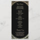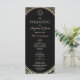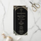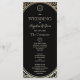 Elegant, chic black wedding program with gold floral swirls art-deco frame and monogram at the top.