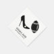 Custom sports theme wedding paper napkins done in white, with graphics of a single black stiletto high heel kicking a black and grey football. Personalise the black and grey text, with the bride and groom's names and wedding date.