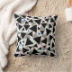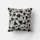 Black and grey geometric triangle Throw Pillow, with small coloured triangles and thin pink stripes.