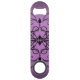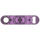 A hearts and swirls design in black on a purple background. Shown here on a bottle opener.