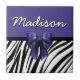 Trendy zebra print pattern in black and white with purple ribbon bow and background. This design is easy to customise with your name or monogram. A cute and modern design that would make a chic personalised gift for a girly girl.