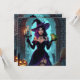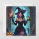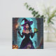 Halloween party invitations with ai art depicting a. beautiful witch in black and purple holding a candelabra and a frog, with a black cat, jack o lantern standing in the doorway of a haunted mansion inviting guests in.