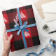 Black and red buffalo plaid patterned wrapping paper with white Christmas trees.