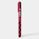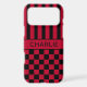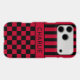 Customise this iPhone 17 pro max case with black and red stripes on the top half and black and red chequered pattern on the bottom half with your name in a modern CAP font in the middle in black on red. It's preppy, trendy and bold - definitely cool!
