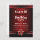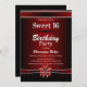 A red and black sweet 16th birthday party invitation featuring white text and a red and white ribbon and bow. Replace the details on this invitation with your own to create the perfect birthday party invitation for your event.