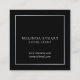 Elegant stylish design featuring monogram, name and details in silver professional font style with silver square border on black background.