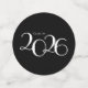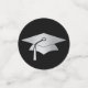 This modern design features a graduation hat and confetti in silver on a background of black with white text.