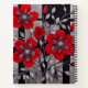 A bouquet of red flowers with silver centres, leaves, and stems is placed against a background of black and silver squares. Very chic and modern mixed media design, ultra stylish, and perfect for home, office, or school.