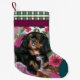 Christmas stocking with Black and tan Cavalier king charles spaniel art design. floral. Holiday Art stocking. green, pink and magenta colours. chequered traditional pattern. Roses, carnations. Option for Small or Large size.
