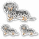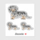 Destei's original cartoon illustration of a cute long hair black and tan dapple coat colour Dachshund breed dog. The design is placed three times on the sheet in two different sizes. There is one larger one and two smaller ones.