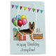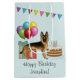 Destei's original cartoon illustration of a black and tan colour German Shepherd breed dog. The dog is placed in a colourful birthday setting. There is a birthday cake with some candles on it, colourful birthday balloons and a bunting banner as well as two present boxes. There is also a personalizable text area.