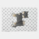 Destei's original cartoon illustration of a black and tan coat colour Shiba Inu breed dog. The background has a pattern of grey dog paw prints.