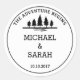 A simple black and white wedding sticker. The design features a simple message saying "the adventure begins" at the top with a simple illustration of a forest. Below, you can customise the design with your names or "Mr & Mrs" or a short message of thanks, with the date of your wedding below.
