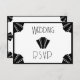 Black and white wedding rsvp card art deco design. Customise this black and white wedding rsvp card with your wedding details. Should you require any help with customising then please contact us through the link on this page. Black and white art deco design personalised wedding rsvp card