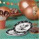 A cute axolotl and birthday balloons themed personalised birthday party paper plates with black and white balloons with polka dots and an axolotl with birthday gifts and balloons.