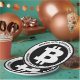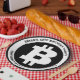 Celebrate in style with custom party supplies. These paper plates are ready to be customised with your own messages with one message at the top and one at the bottom. In the centre is a Bitcoin symbol in black against a white background.