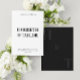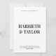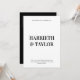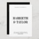This wedding invitation features a clean, minimalist design with bold, centred typography, using large serif fonts for the couple’s names and smaller, uppercase text for the event details, all against a simple white background. The back has black background with 2 initial monogram.