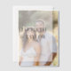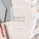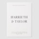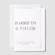 This wedding invitation features a clean, minimalist design with bold, centred typography, using large serif fonts for the couple’s names and smaller, uppercase text for the event details, all against a simple white background.