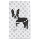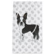 Destei's original cartoon illustration of a cute black and white coat colour Boston Terrier breed dog. The background has a pattern of grey dog paw prints.
