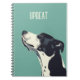 This notebook features a boxer dog illustration over a green background with the customisable default text "upbeat". This is a great design for Boxer owners, dog owners, and dog lovers.