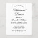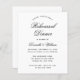 A simple, minimalist black and white rehearsal dinner invitation. It has just black text on white background. The words "Rehearsal Dinner" and the name are written in an elegant calligraphic script.