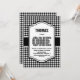 Black and white buffalo plaid 1st birthday party invitation featuring a vibrant black and white checked number one.