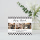 Custom buffalo plaid photo wedding announcement holiday postcards featuring a snowy black and white buffalo plaid background with 3 photos in the centre and a beautiful hand-lettered script title above. Easily personalise this buffalo plaid holiday postcard with your images, message, and your family name.