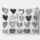 Playful cat tugging at a heart shaped balloon surrounded by different patterned hearts in black and white.