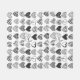 Playful cat tugging at a heart shaped balloon surrounded by different patterned hearts in black and white.