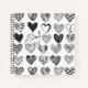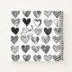 Playful cat tugging at a heart shaped balloon surrounded by different patterned hearts in black and white.
