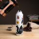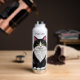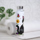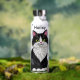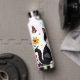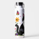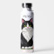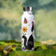 A sweet personalized water bottle with a cute illustration of a black and white cat surrounded by flowers and butterflies in a paper quilling impasto style.