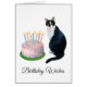 A black and white cat with a birthday cake ablaze with candles. Send out this elegant birthday card to any a cat lover.