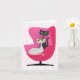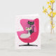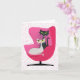 This notecard has two mid century cats wearing diamond gem collars, one is black with green eyes, one white with yellow eyes sitting in vibrant pink chair on a white background with hot pink dots.